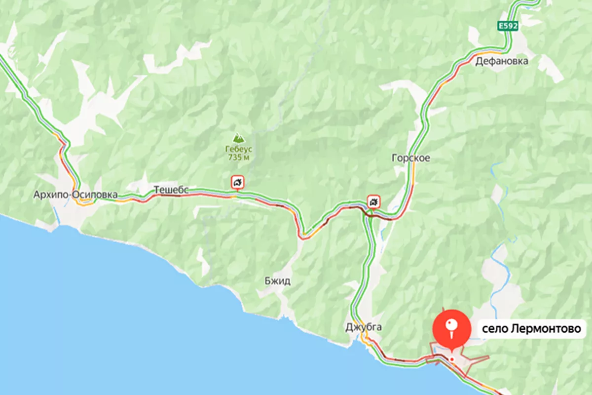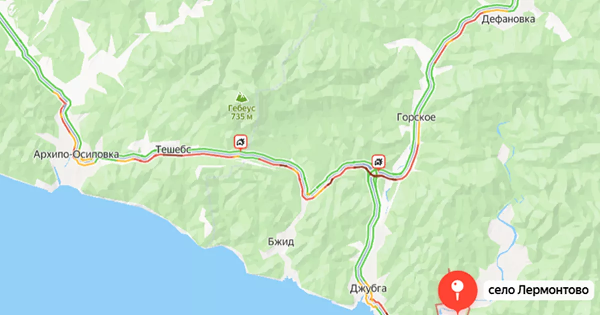 По данным «Яндекс. Карты», одна из пробок растянулась от Кроянского до моста через реку в Туапсе. Другая - от Предгорного до выезда из Новомихайловского. Стоят машины от Широкой Щели через Лермонтово до Джубги.