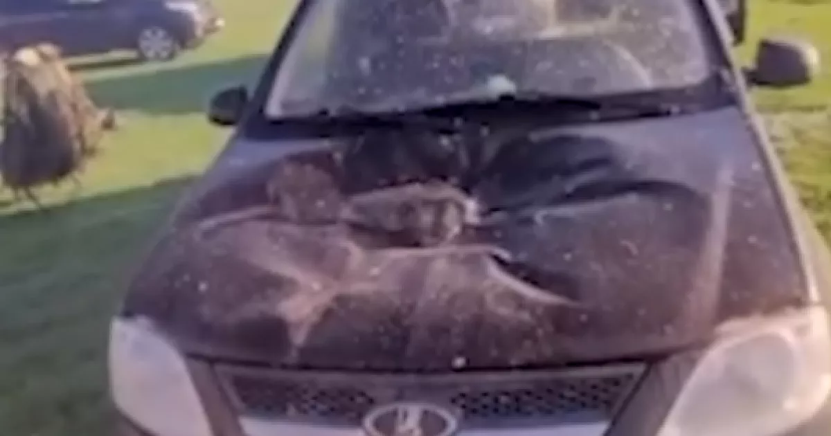 Итог оказался впечатляющим, но крайне неприятным. Взрыв разорвал арбуз на части, которые разбросало вокруг эпицентра событий. При этом основная сила удара пришлась на капот. Металл у отечественной легковушки сильно деформировался, появились глубокие вмятины и трещины на краске.