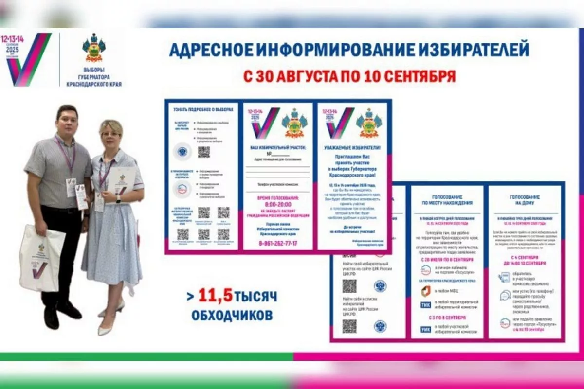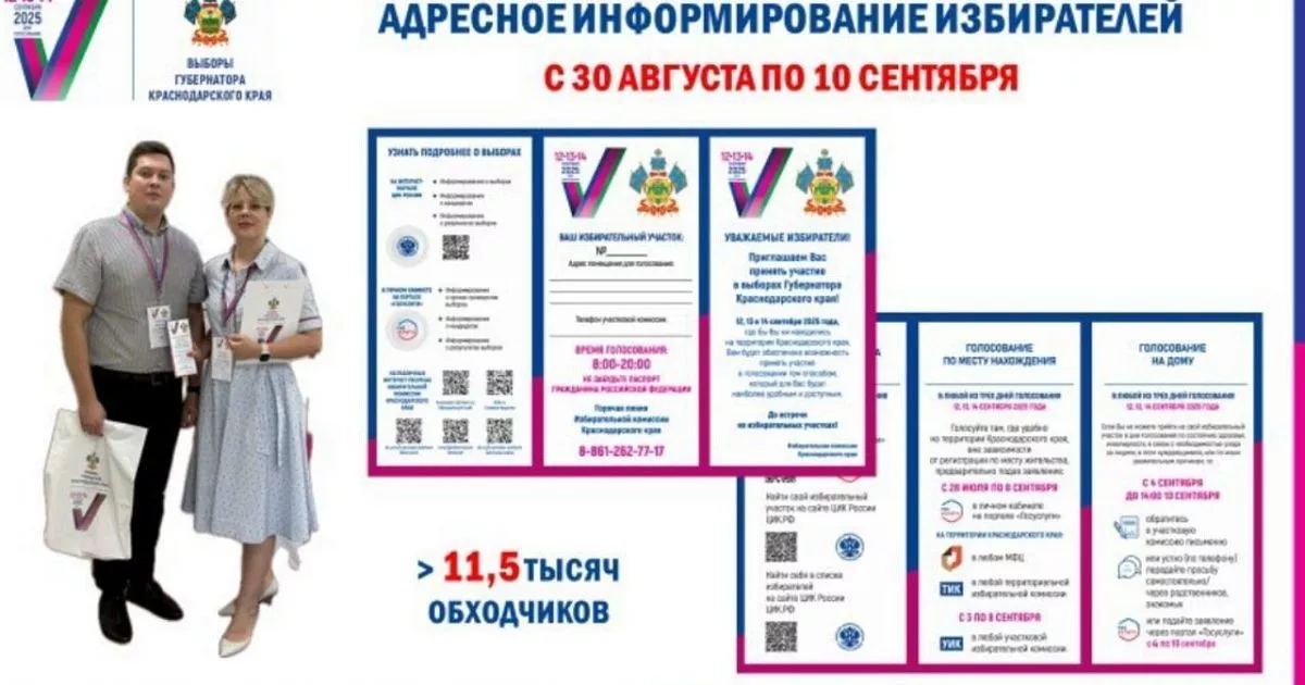 С 30 августа по 10 сентября в Краснодарском крае пройдет адресное информирование избирателей, в котором примет участие более 11,5 тыс. обходчиков. Об этом сообщает региональный избирком в своем Telegram-канале.