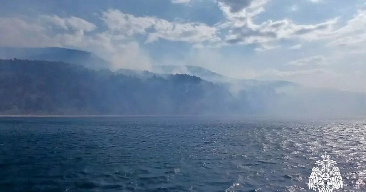 Туристы, заблокированные лесным пожаром, возникшем в Геленджике в результате ночной атаки БПЛА, доставлены на безопасный пляж в селе Криница.