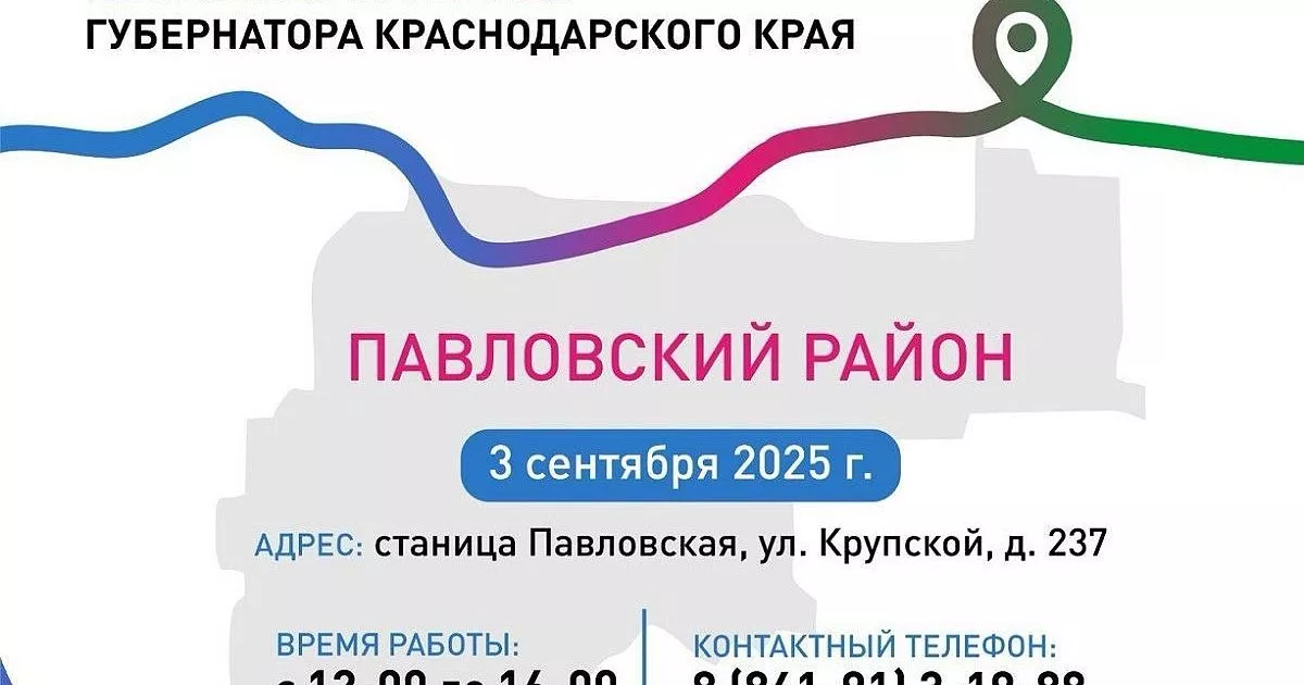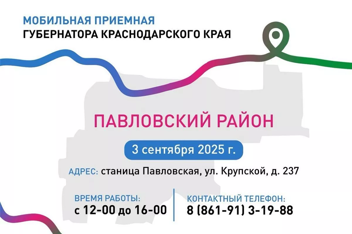 В среду, 3 сентября, мобильная приемная будет работать в станице Павловской по ул. Крупской, 237 с 12.00 до 16.00. В среду, 24 сентября, прием жителей состоится в Темрюке по ул. Ленина, 29 с 12.00 до 16.00, сообщает пресс-служба краевой администрации.