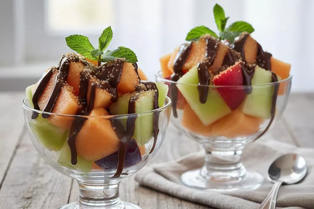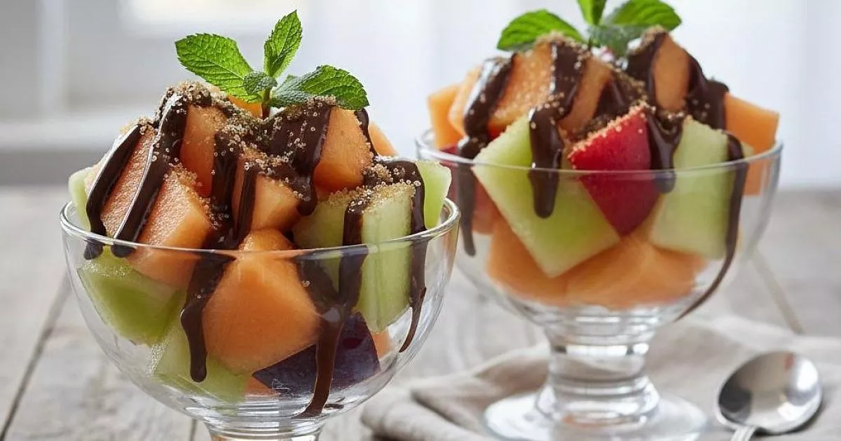 Десерт готовится всего за 15 минут без выпечки. Нарежьте дыню и сливы ломтиками, выложите в креманки. Растопите темный шоколад на водяной бане или в микроволновке, добавив щепотку коричневого сахара. Полейте фрукты теплым шоколадом и украсьте мятой.