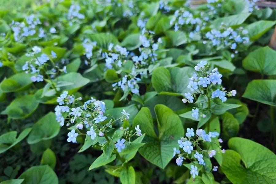 Бруннера зацветает одной из первых, в апреле-мае. Ее облачко из голубых цветов и крупная листва, которая сохраняет красоту до самых морозов, станут украшением любого тенистого уголка.