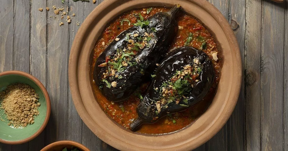 Ингредиенты: баклажаны – 2-3-4 штуки (по количеству членов семьи), лук – 1 шт, морковь – 1 шт, болгарский перец – 1 шт, помидоры – 2-3 шт, орехи (грецкие, кедровые, миндаль) – 50 грамм, зелень (петрушка, укроп, кинза) – по вкусу, чеснок – 2-3 зубчика, растительное масло – для жарки, соль и перец – по вкусу, специи (кориандр, зира, паприка) – по желанию, сыр тертый (твердый или моцарелла) – по желанию (для посыпки), панировочные сухари или манка – для посыпки противня (опционально).