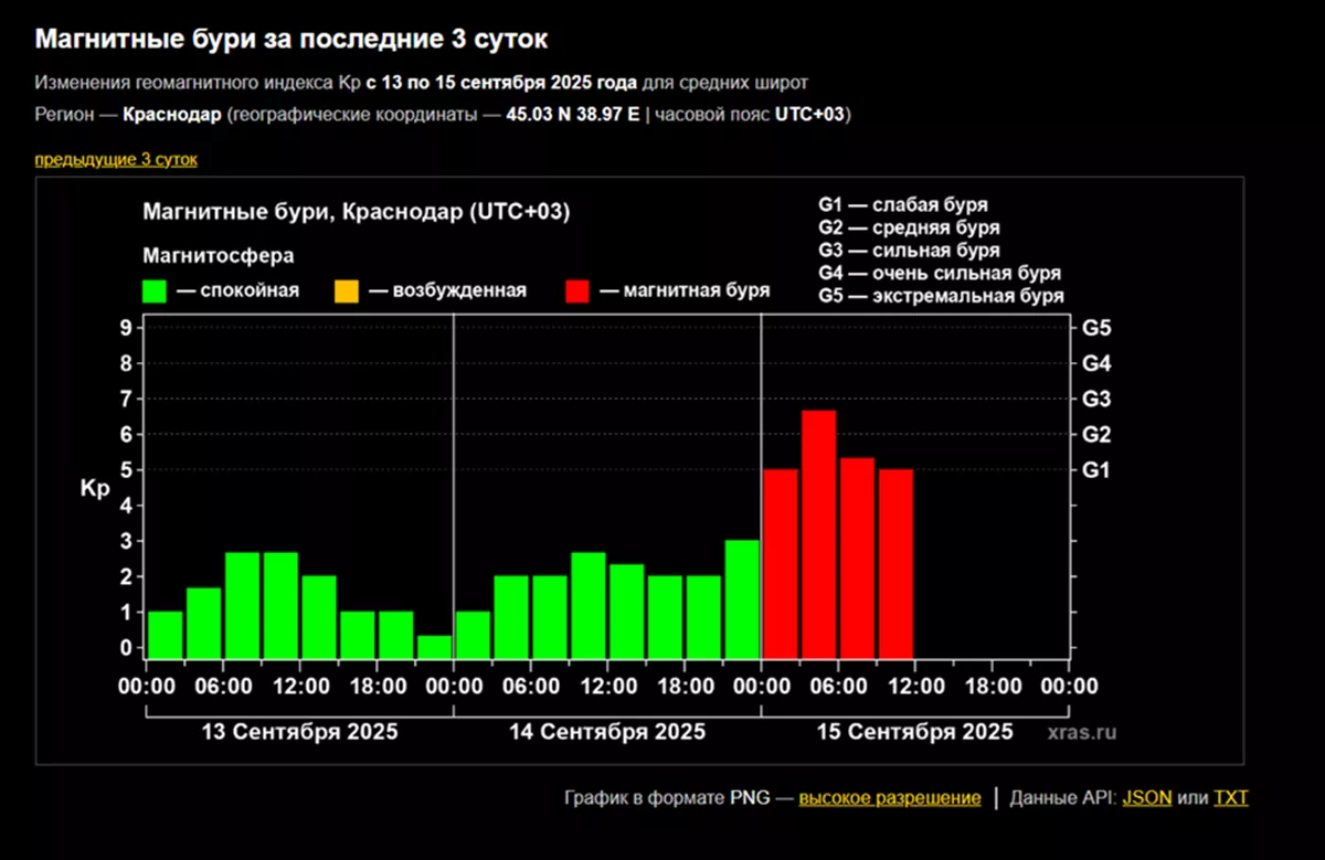 Пик ее пришелся на ранее утро 15 сентября, когда она максимально приблизилась к значениям уровня G3.