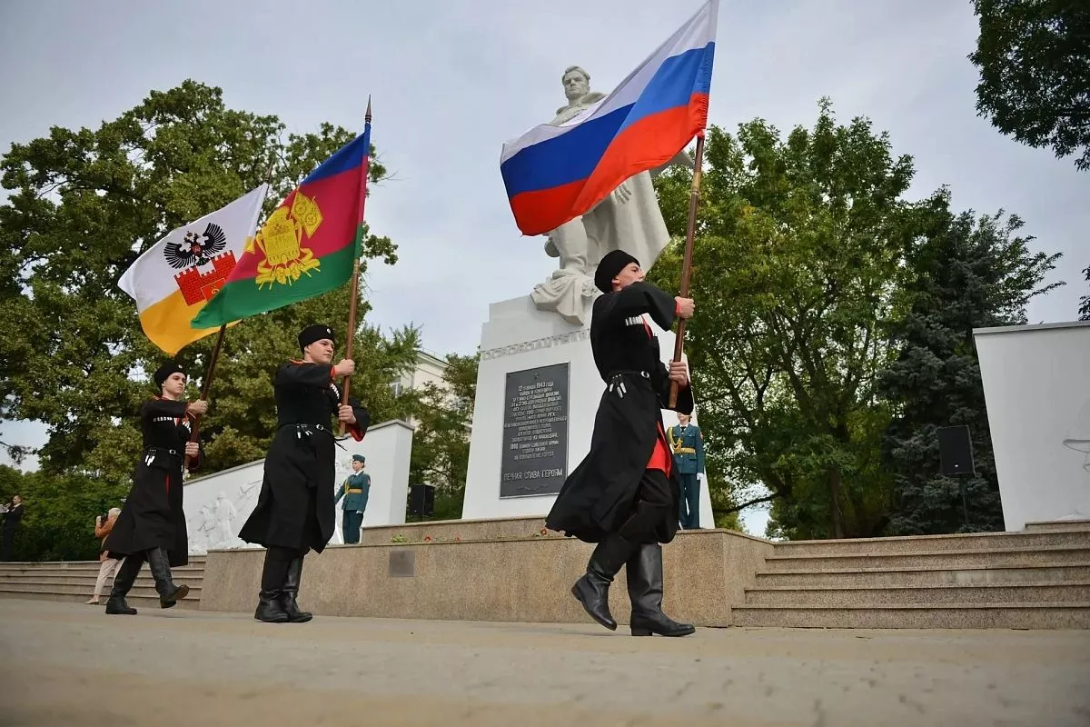 На Площадь Победы вынесли флаги России и Кубани, а также боевое знамя 9-й Пластунской стрелковой дивизии.