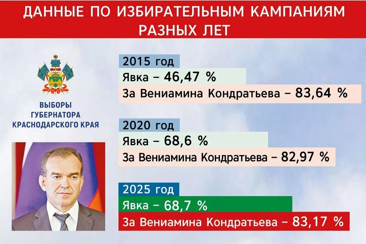 По предварительным данным, с колоссальным отрывом от соперников победил Вениамин Кондратьев, за которого отдали голоса 83,17 процента избирателей, более двух с половиной миллионов кубанцев. Кстати, пять лет назад главу региона поддержали 82,97 процента избирателей.