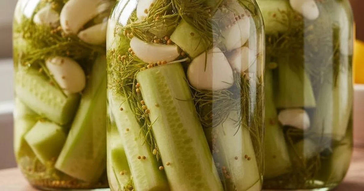 Для более нежной текстуры с огурцов снимается кожура, после чего их аккуратно разрезают вдоль на четвертинки. На дно в каждую стерилизованную банку кладут зонтик укропа, зубчик чеснока и ложку горчицы в зернах. Огурцы укладываются не слишком плотно, чтобы сохранить циркуляцию рассола.