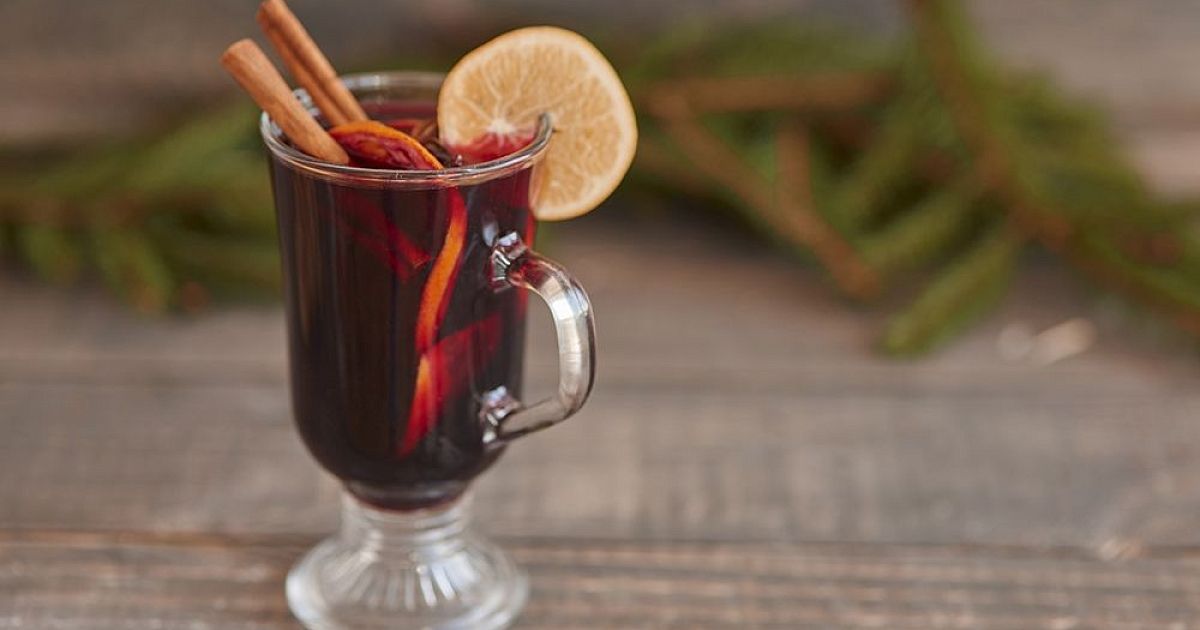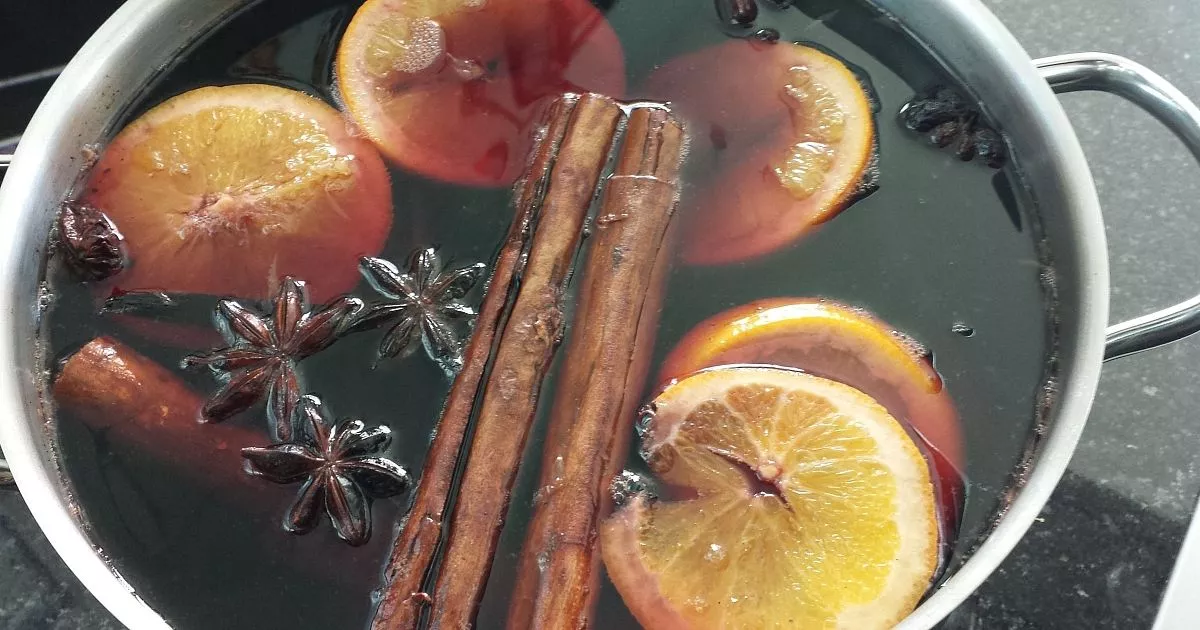 Ингредиенты на 4 порции: красное сухое вино — 750 мл (например, Каберне или Мерло). Мед или тростниковый сахар — 3-4 ст.л. Апельсин — 1 шт. (нарезать дольками). Яблоко — 1 шт. (нарезать ломтиками). Специи: корица — 2 палочки, гвоздика — 5 бутонов, бадьян — 2 звездочки, мускатный орех — щепотка. Имбирь свежий — 2 тонких ломтика.