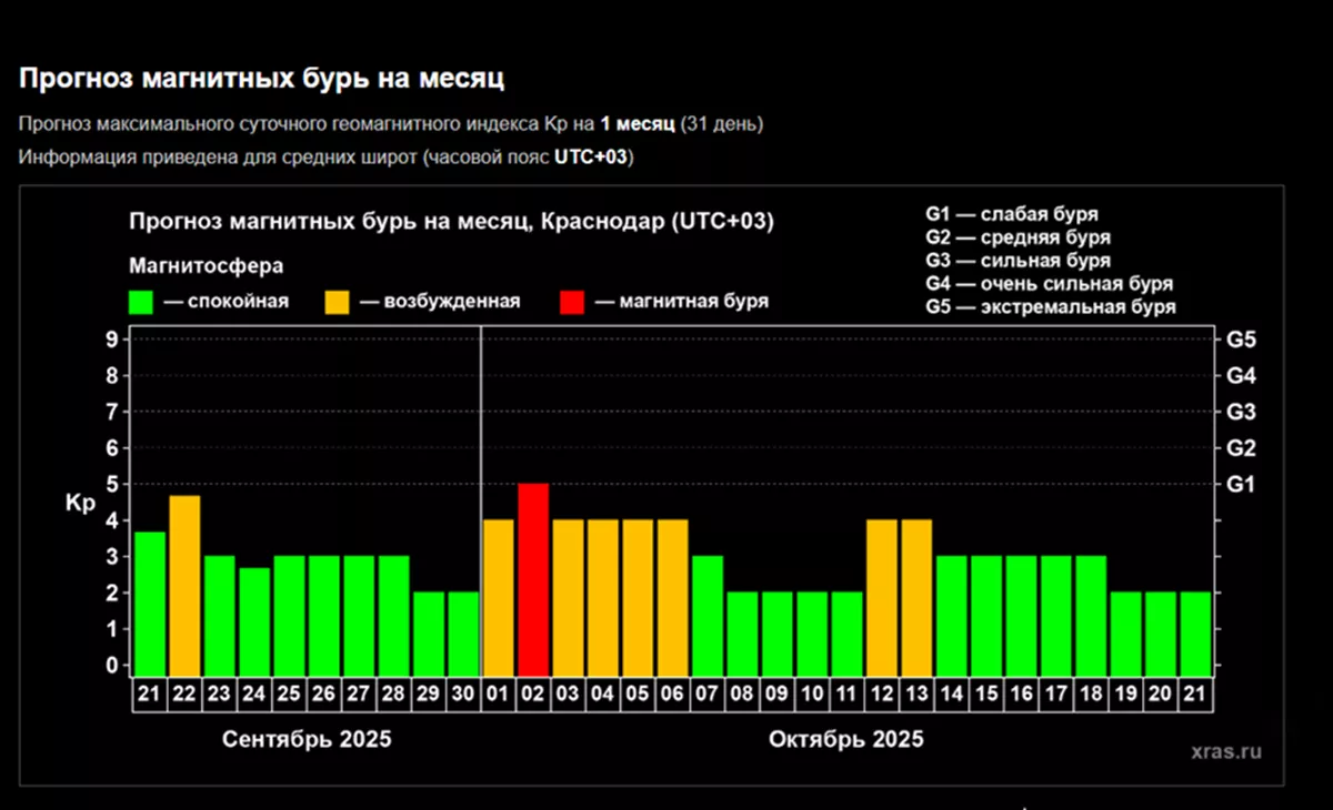 Несколько магнитных бурь могут ударить по Земле в октябре. По данным ученых Лаборатории солнечной астрономии ИКИ и ИСЗФ РАН, слабая магнитная буря возможна 22 сентября. С начала следующего месяца – с 1 по 6 число - вероятность геомагнитных возмущений возрастет. В отдельные дни они могут достигнуть «красного» уровня. Наиболее вероятна магнитная буря 2 октября.