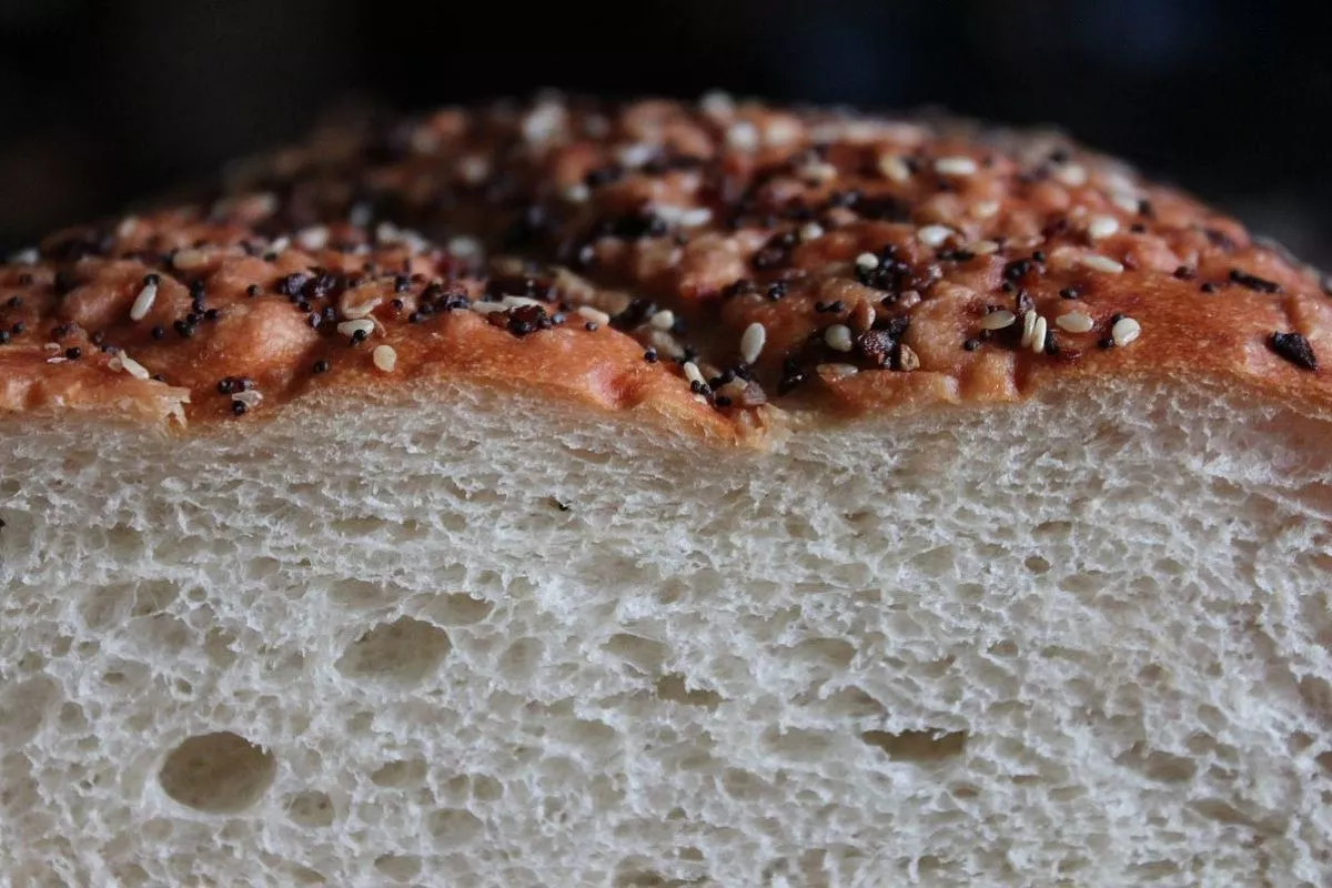 Смазываем поверхность хлеба небольшим количеством воды и щедро посыпаем кунжутом (или семенами льна). Выпекайте хлеб в духовке, разогретой до 200 градусов примерно 40 минут.