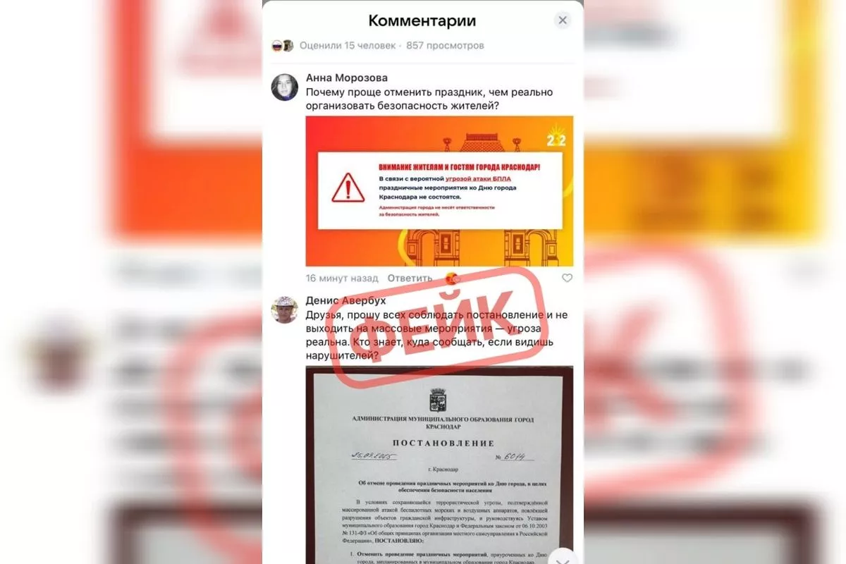 В соцсетях и пабликах распространяется информация, якобы об отмене праздничных мероприятий ко Дню города, в публикациях используются фотографии поддельного постановления и видоизмененные картинки, которые ранее публиковались на официальных страницах администрации. Это - фейк! Об этом сообщили в пресс-службе мэрии кубанской столицы.