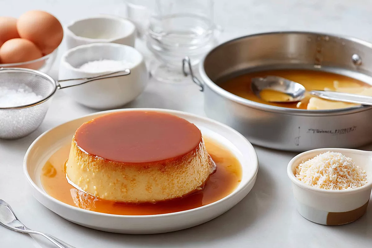 Яйца — 4 шт; сахар — 90 г; молоко кокосовое — 200 мл; сливки — 200 мл; кокосовая стружка — 70 г; сахар для карамели — по необходимости
