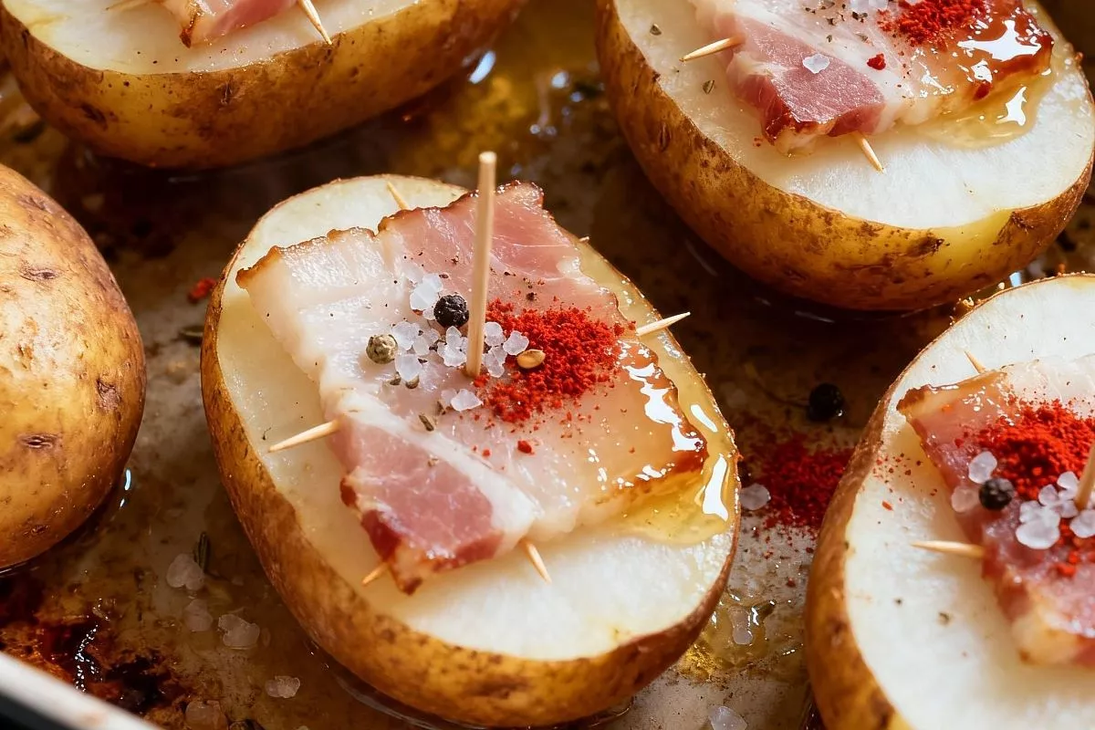 Главный секрет кроется в простоте и технологии приготовления. Несколько некрупных, хорошо вымытых картофелин разрезаются пополам. Сало нарезается довольно толстыми ломтиками — не стоит его жалеть, так как в процессе запекания оно будет таять, пропитывая картофель жиром и насыщенным вкусом, делая его сочным изнутри и с хрустящей корочкой снаружи. Этот метод запекания картофеля с салом гарантирует, что блюдо не будет сухим.