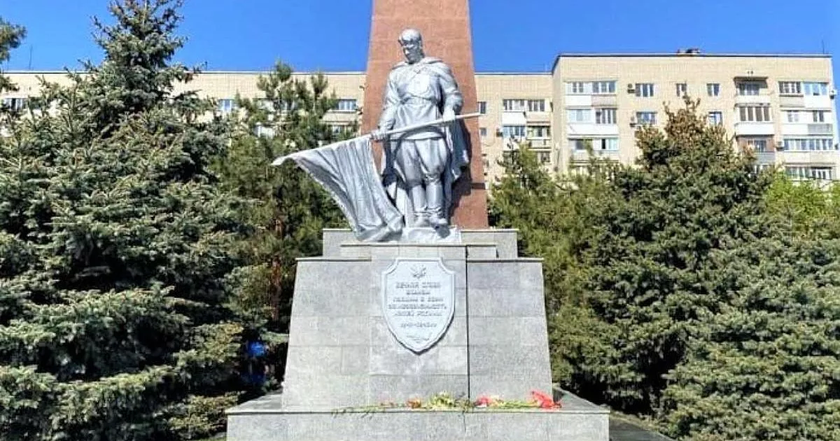 Западную часть площади замыкает поставленная на стилобате монументальная композиция. Она включает массивный обелиск на постаменте, возле которого размещена скульптура советского воина с опущенным знаменем.