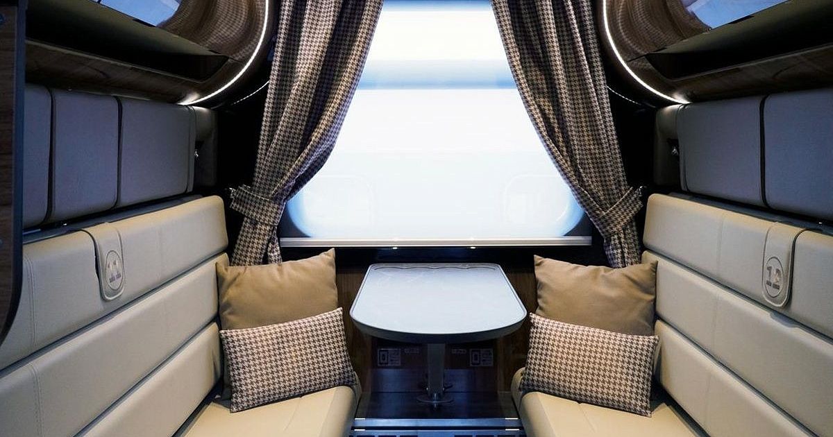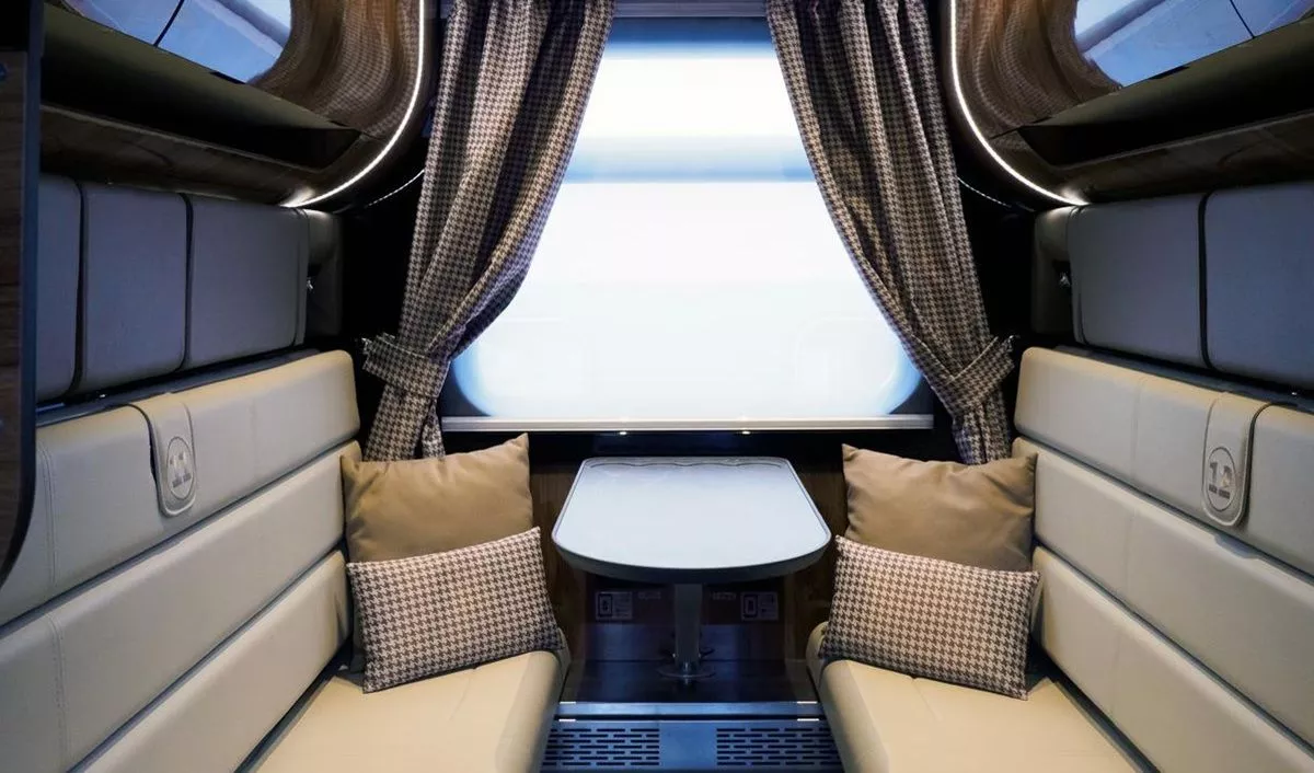 Уточняется, что вагоне всего восемь купе, в каждом из них есть возможность настройки освещения, вместительные закрытые полки для ручной клади, специальные места для верхней одежды, мультимедийные экраны с опцией выбора контента, индивидуальные светильники, розетки и USB-разъемы, кнопка вызова проводника и другие удобства.