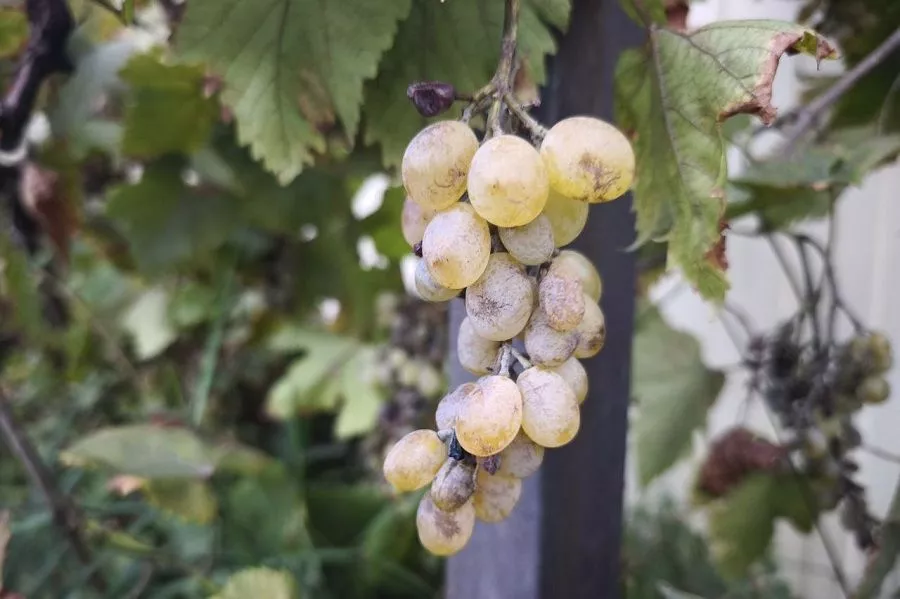 Оидиум, или мучнистая роса, еще одно серьезное грибковое заболевание винограда. Его признаки: белый мучнистый налет на поверхности листьев, побегов и ягод, который распространяется по всему растению, вызывая отмирание тканей и снижение урожайности. Для борьбы с оидиумом рекомендуют применять железный купорос.