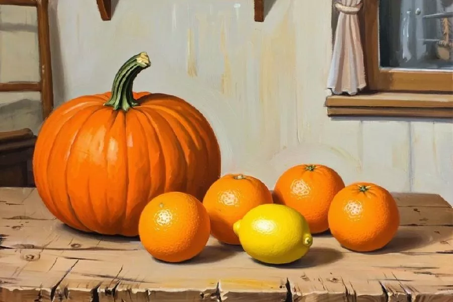 Очистите от кожуры и нарежьте кубиками 2 апельсина. Еще 2 – нарежьте вместе с кожурой. Это придаст приятную горчинку и дополнительный аромат. Лимон тоже нарежьте целиком, без очистки, и добавьте к тыкве и апельсинам.