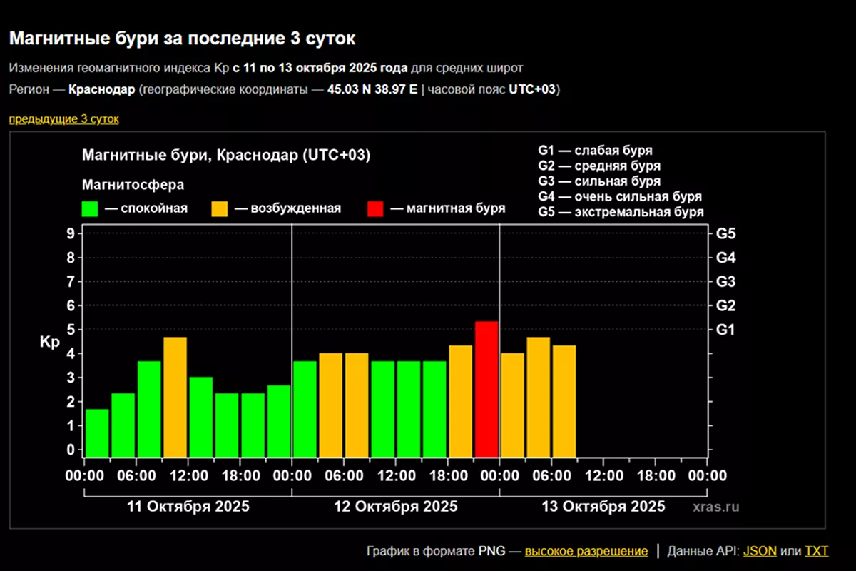 Магнитная буря уровня G1 ударила в ночь на 13 октября по Земле. Она была непродолжительной. Геомагнитное поле нашей планеты все еще остается в возмущенном состоянии из-за солнечного ветра, вырвавшегося в космическое пространство из корональной дыры.
