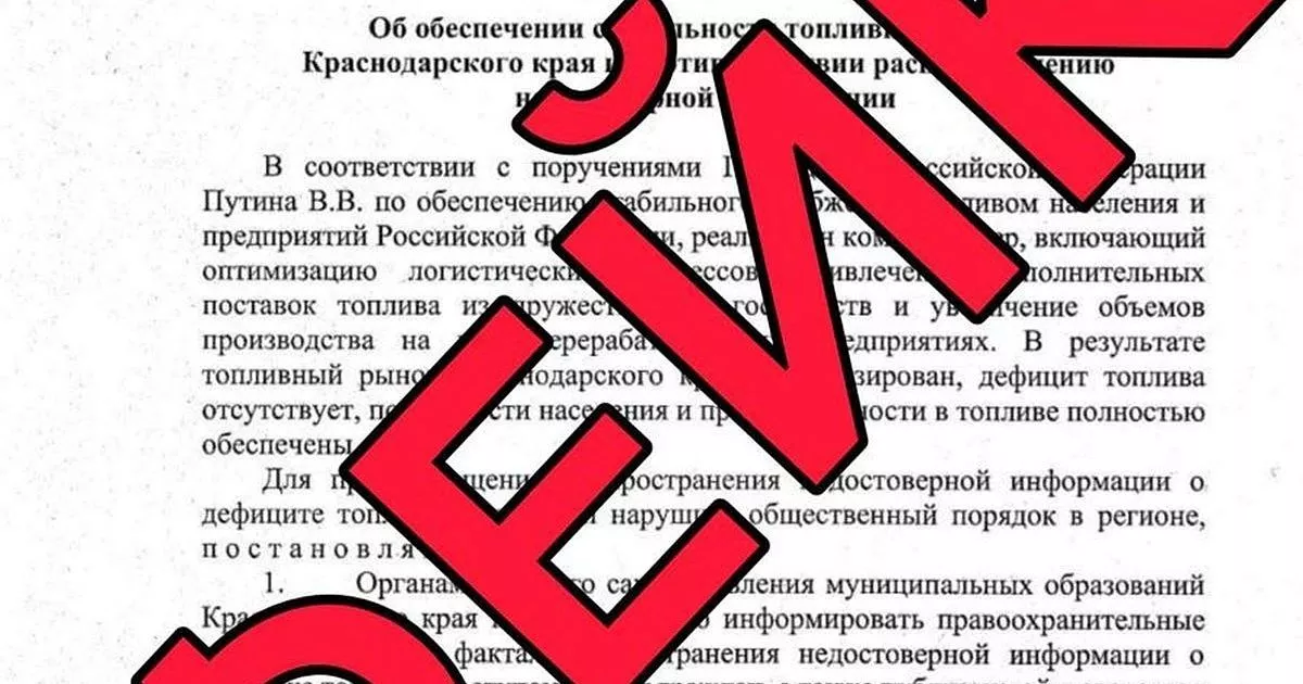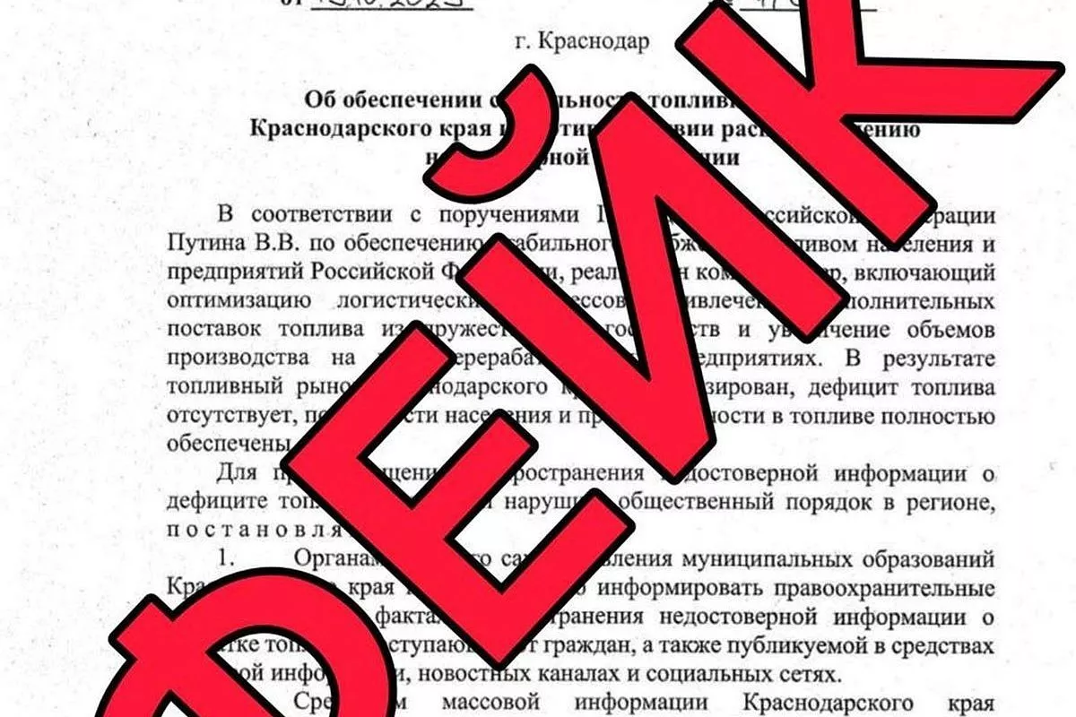 В мессенджерах и соцсетях распространяется поддельное постановление губернатора «Об обеспечении стабильности топливного рынка Краснодарского края и противодействии недостоверной информации». В тексте говорится, что муниципальные власти теперь якобы обязаны сообщать в правоохранительные органы о фактах распространения информации о нехватке топлива. Это фейк.