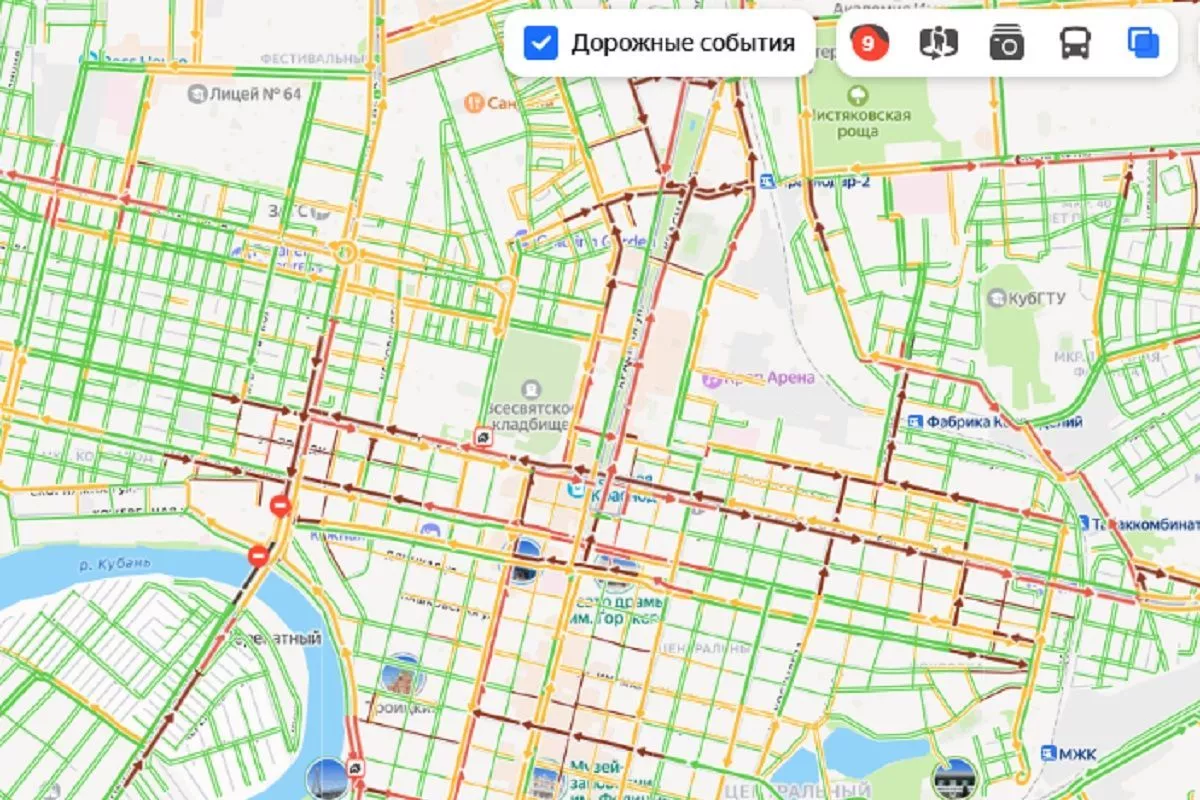 В конце рабочей недели на дорогах Краснодара образовались многокилометровые заторы. По данным «Яндекс.Карты», загруженность дорог оценивается в девять баллов.