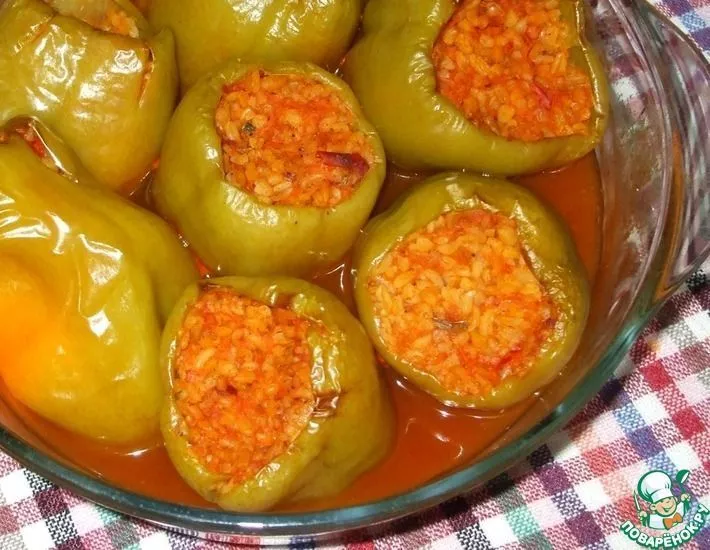 Добавьте два яйца, тщательно перемешайте и готовьте до их готовности, но не переварите. Наполните перцы приготовленной начинкой, оставив немного места. Уложите перцы в форму размером 26 x 30 x 5,5 см, предварительно сделав несколько небольших надрезов сверху для выхода пара.