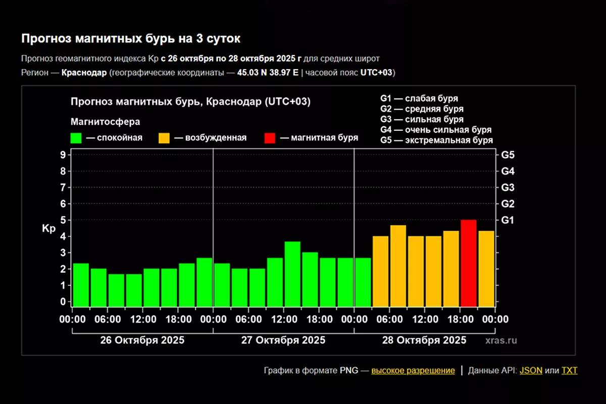 По прогнозу, опубликованному на сайте Лаборатории солнечной астрономии ИКИ и ИСЗФ РАН, рост геомагнитной активности начнется с раннего утра 28 октября. Уровня магнитно бури он достигнет вечером. Вероятность составляет 75%. Продолжится она и 29 октября.