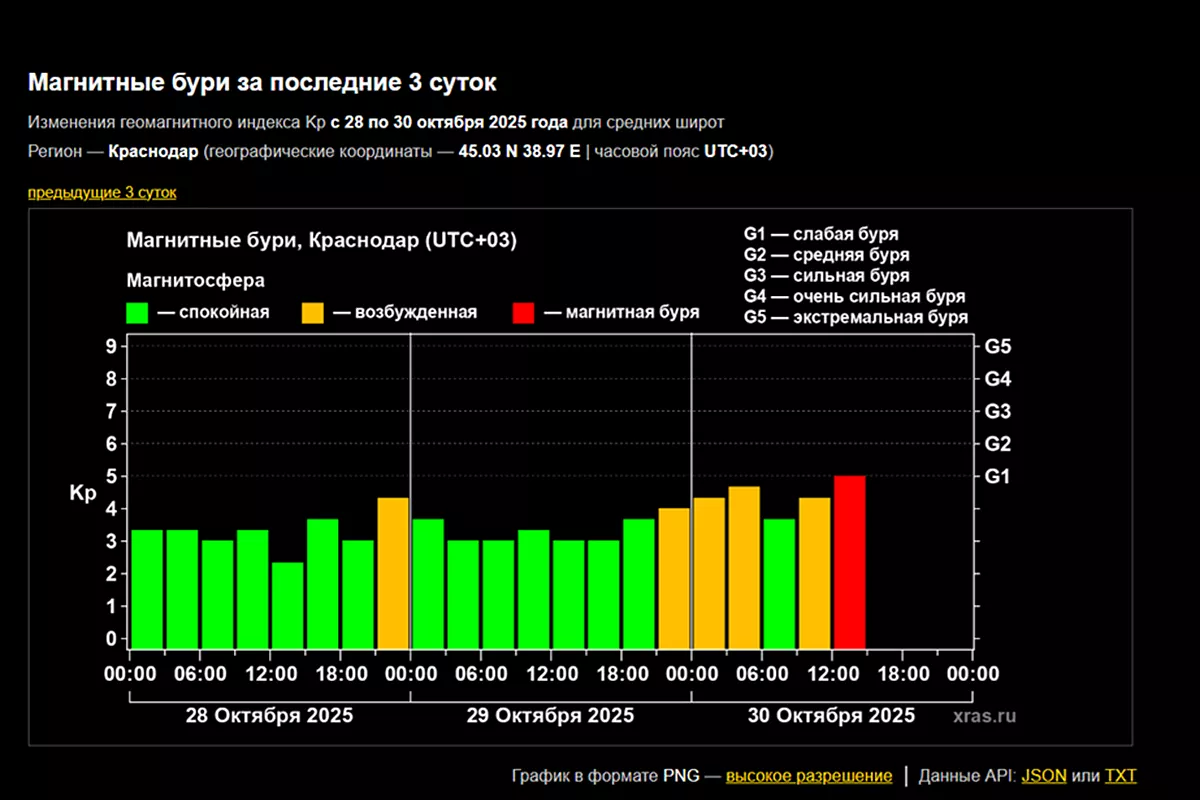 Магнитная буря уровня G1 началась на Земле во второй половине дня 30 октября. Ученые предупреждали о возможном росте геомагнитной активности с пиковыми значениями в ночь на 29 октября.