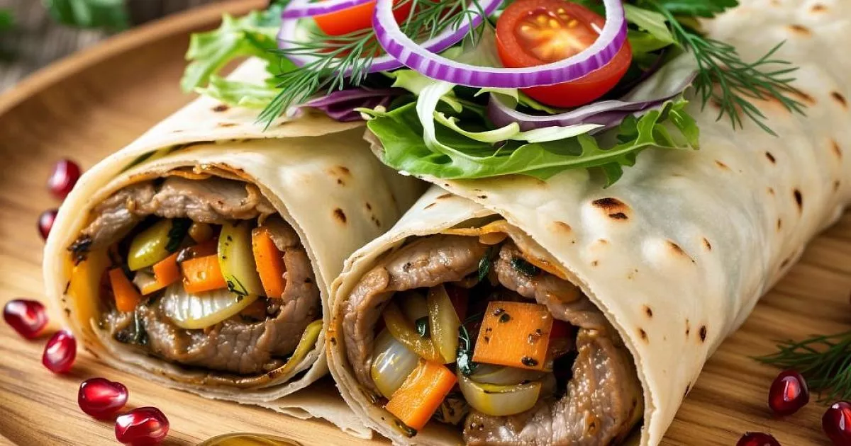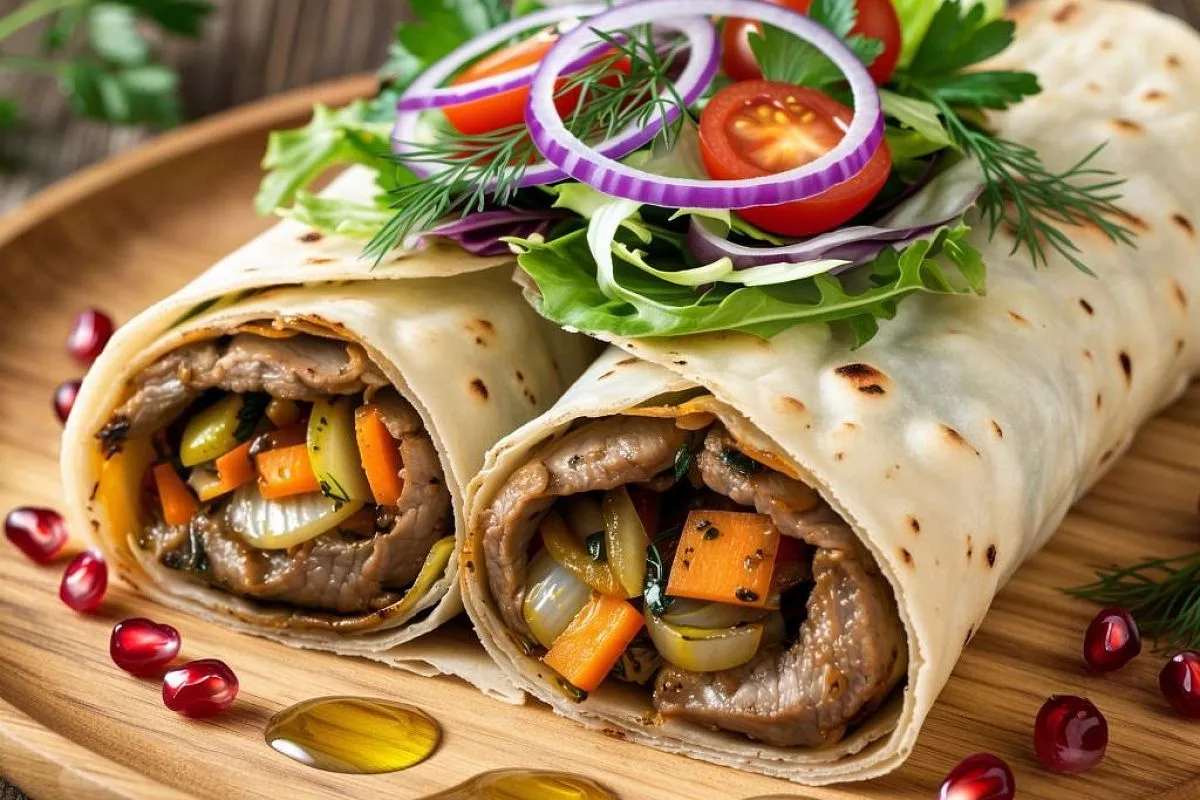 Ингредиенты: лаваш тонкий — 1 лист; фарш говяжий — 300 г; лук репчатый — 1 шт.; оливки черные и зеленые без косточек — по 12–15 шт.; морковь — 1 шт.; перец сладкий (болгарский) — 1/3 крупного перца (по желанию); яйцо — 1 шт.; сметана — 2–3 ст. л.; соль, перец черный молотый, специи — по вкусу; масло растительное для обжарки и смазывания лаваша.
