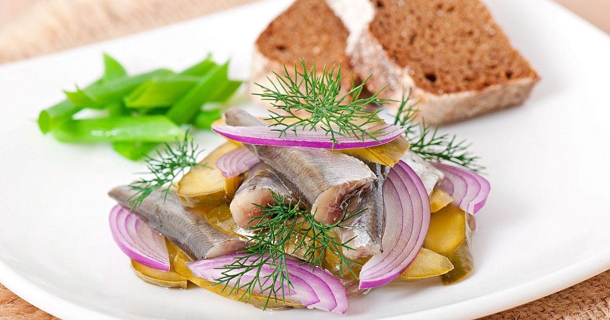 Рецептура рассчитана на 8 порций: свежемороженая сельдь — 1–2 шт., кориандр сушеный — 5 г; лук-репка — 1 шт.; соль морская мелкого помола или поваренная — 1–1,5 ст. л.; лавровый лист сушеный — 1–2 шт.; перец горошком — 5–6 шт.; растительное масло или оливковое — 5–7 ст. л.