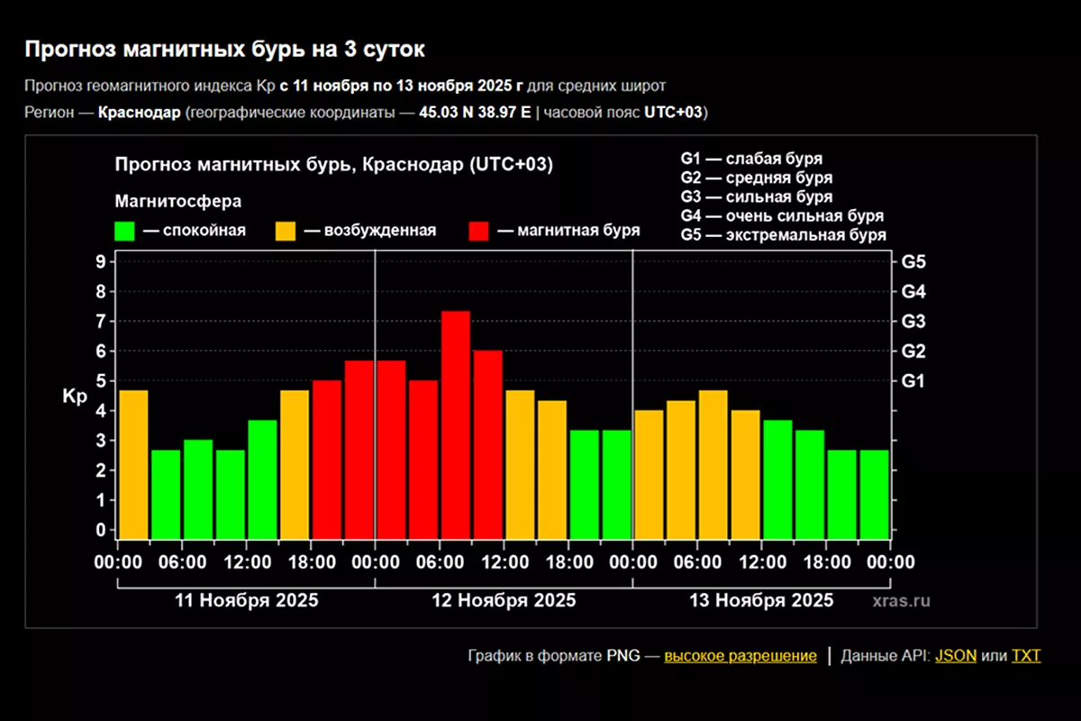 - В конце дня (по московскому времени) ожидаются магнитные бури уровня G1-G2 с возможным выходом на пик G3-G4 завтра 12 ноября, - уточняется в публикации ученых. - Сохраняются риски повторных сильных вспышек, включая события высшего балла.