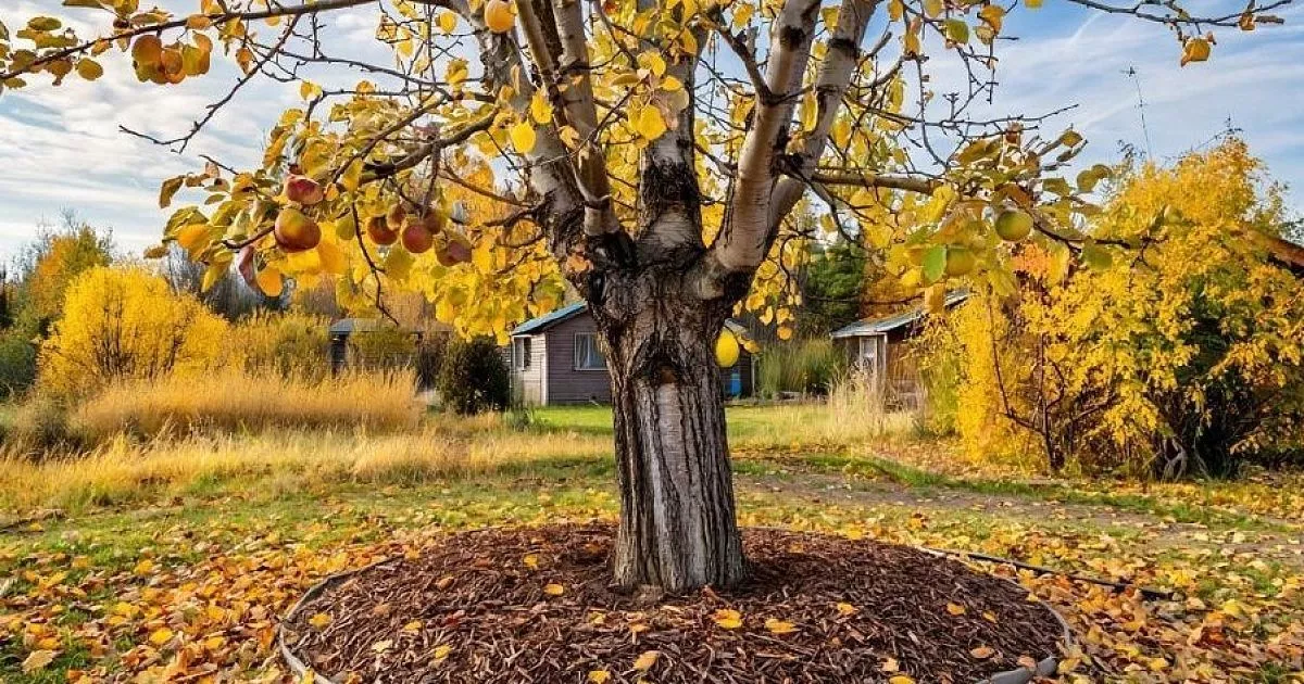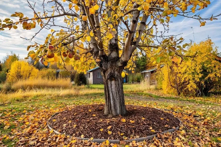 При наступлении осени и после того, как опадут листья, старую мульчу обязательно нужно убрать вместе с опавшими листьями. Дело в том, что в мульче и листьях могут зимовать вредители, которые весной начнут портить дерево. После удаления старой мульчи лучше разложить свежий компост, который не только утеплит корни на зиму, но и послужит отличным питанием на следующий сезон.
