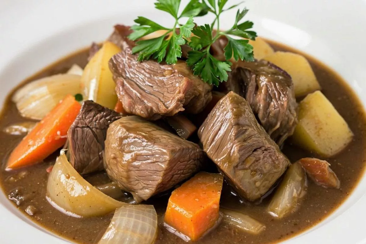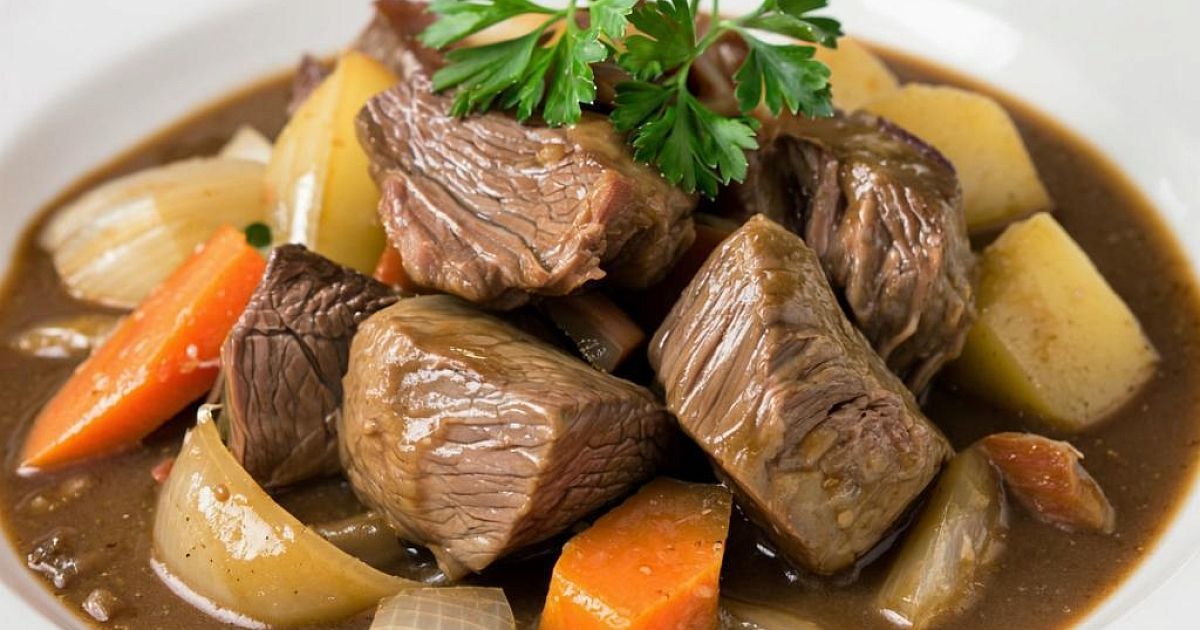 Обжарьте кусочки до золотистой корочки — это усилит вкус всего блюда. Добавьте лук и дайте ему слегка зарумяниться. Влейте горячую воду или бульон — так мясо быстрее начнет размягчаться.