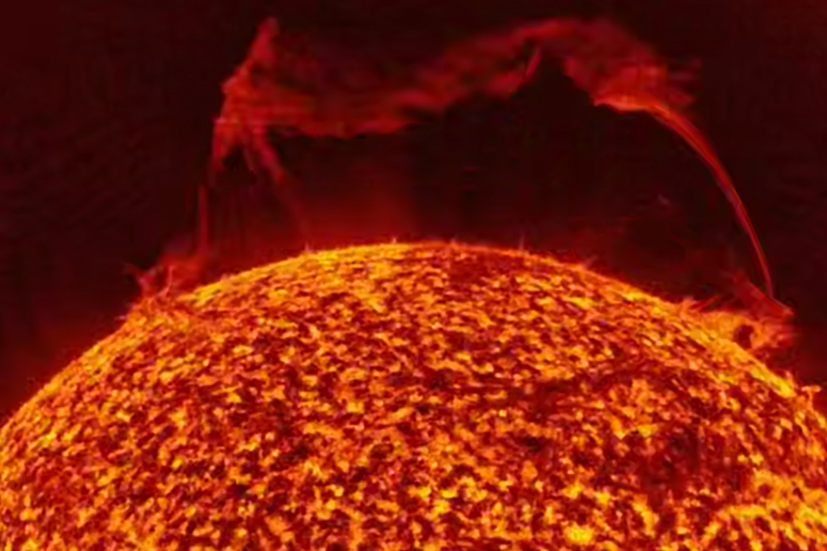 Гигантских размеров протуберанец оторвался ночью от Солнца. Он в 80 раз больше Земли. Место его отделения от светила исключает возможность влияния на нашу планету. Об этом сообщили в Лаборатории солнечной астрономии ИКИ и ИСЗФ РАН.
