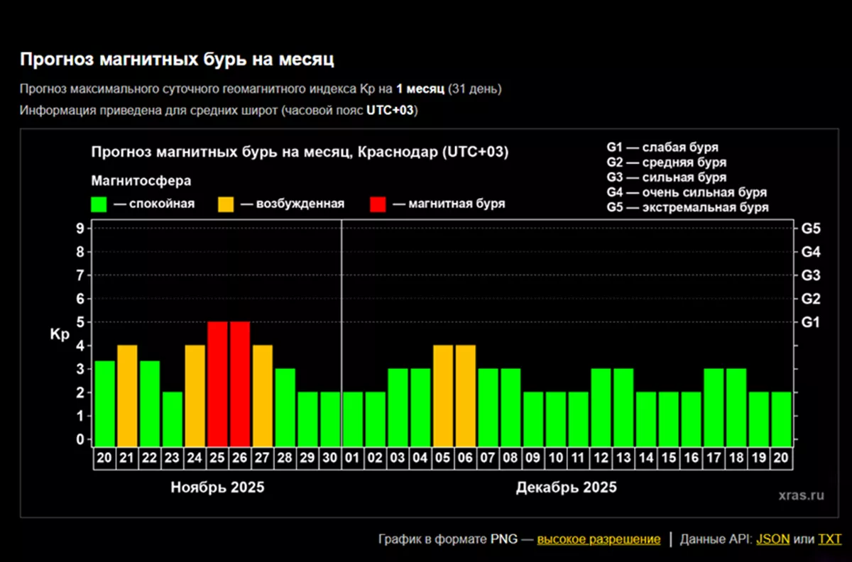 Несколько магнитных бурь могут ударить по Земле до конца осени. По данным ученых Лаборатории солнечной астрономии ИКИ и ИСЗФ РАН, слабые магнитные бури возможны 25 и 26 ноября. Всплески геомагнитной активности, которые не выйдут из «желтой» зоны, также ожидаются 21, 24 и 27 числа.