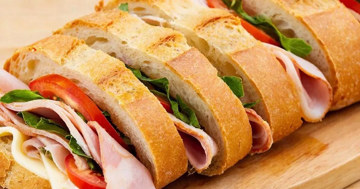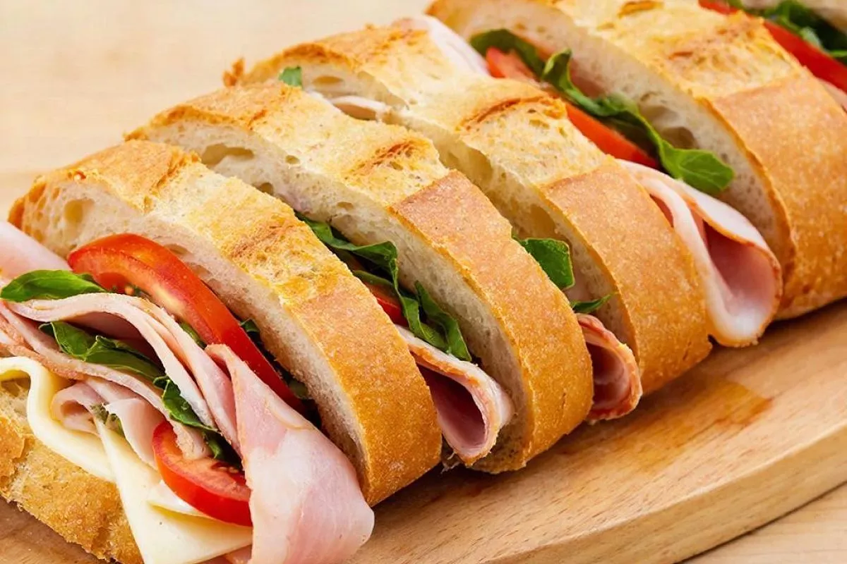 Ингредиенты: французский багет — 255 г; листовой шпинат — 100 г; грецкие орехи или фисташки — 50 г; укроп или петрушка — 1/4 пучка; сыр типа Филадельфия или плавленый сырок — 125 г; растительное масло — немного; жирные сливки или молоко — 1 ст. л.; сушеный чеснок — 1/2 ч. л.; сушеный лук — 1/2 ч. л.; соль крупная, черный перец — по вкусу; мясо (ветчина, запеченная говядина, куриная грудка) или копченая рыба — 500 г; дижонская горчица в зернах — 1 ст. л.; хрен (по желанию) — 1 ст. л.; майонез — 80 мл.