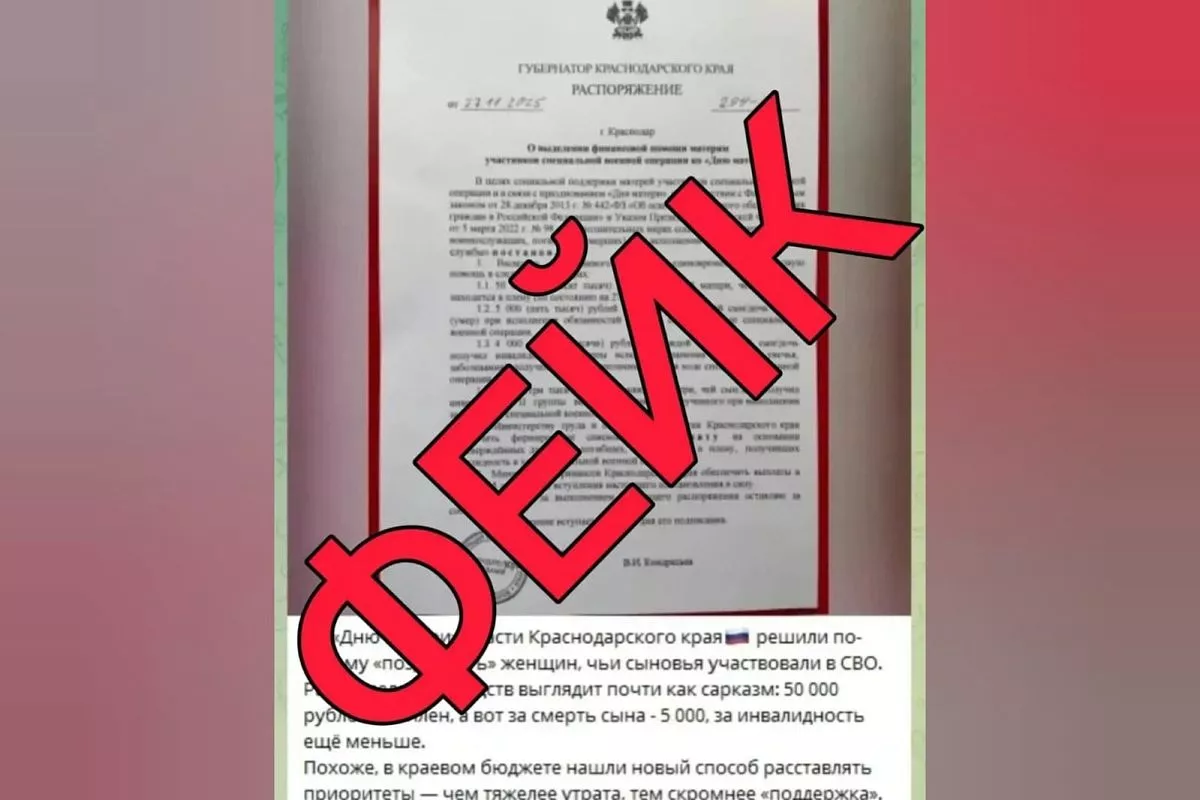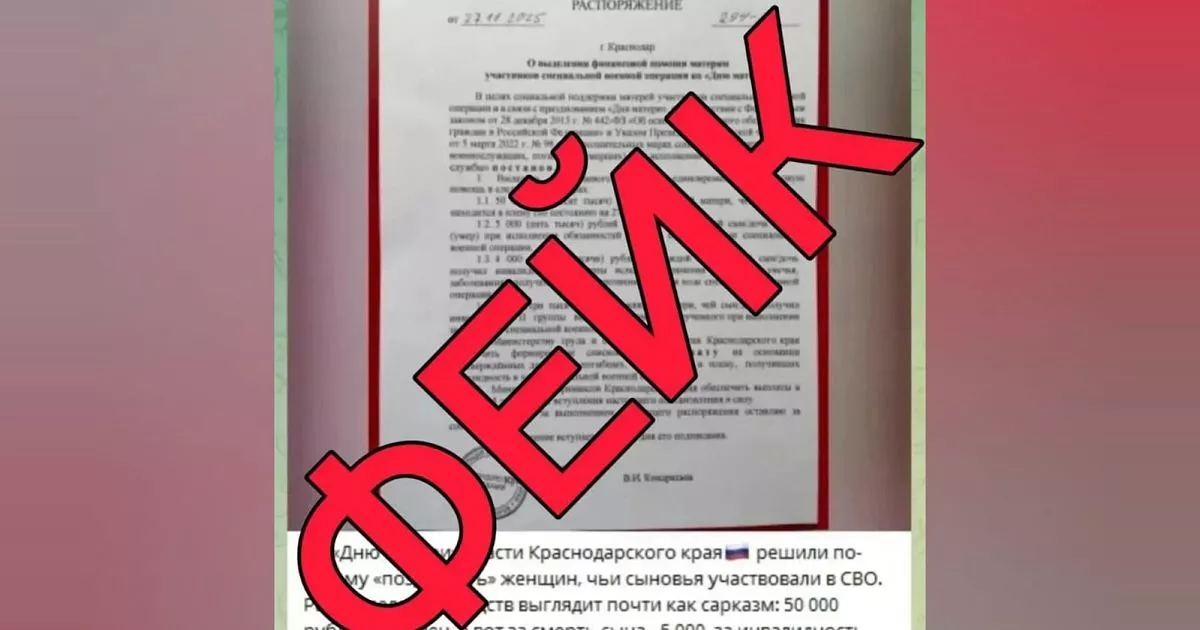 В фальшивом документе, который распространяется в мессенджерах и социальных сетях, говорится о выплатах ко Дню матери тем, у кого сын-участник спецоперации попал в плен, погиб или получил инвалидность.