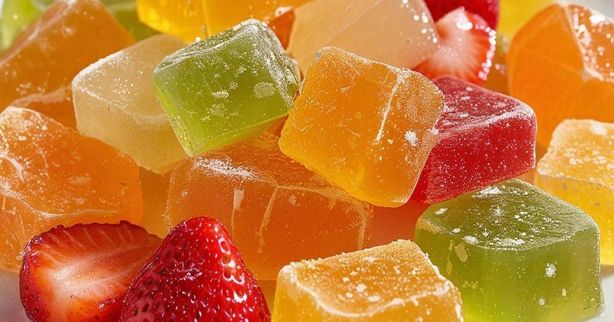Застывший мармелад нарезать кубиками размером 2×2 см. По желанию можно посыпать его кокосовой стружкой для дополнительного вкуса.