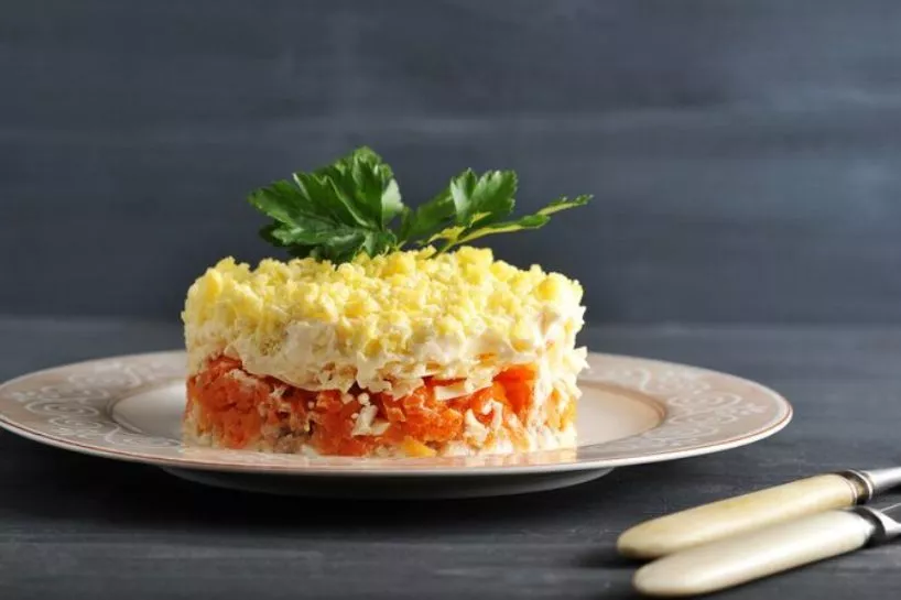 Третьим слоем выложите морковь, предварительно смешанную с половиной майонеза.