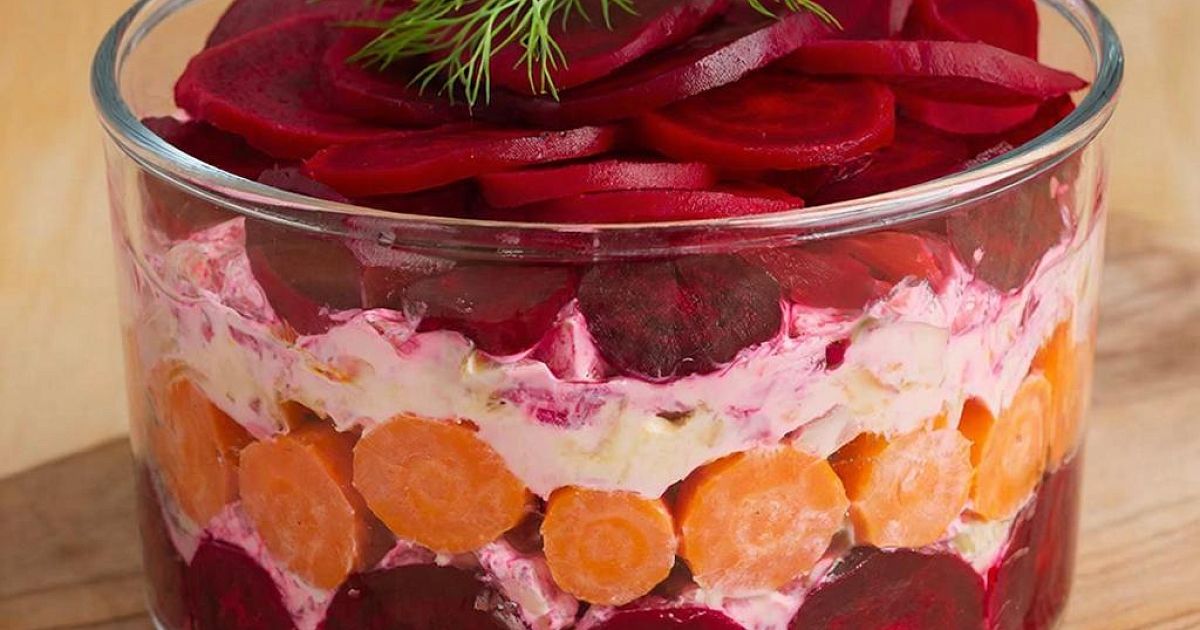 Натрите морковь на крупной терке и выложите следующим слоем, также смажьте майонезом. Завершите салат слоем натертой свеклы, смазанной майонезом. Поставьте салат в холодильник на 30 минут, чтобы слои хорошо пропитались.