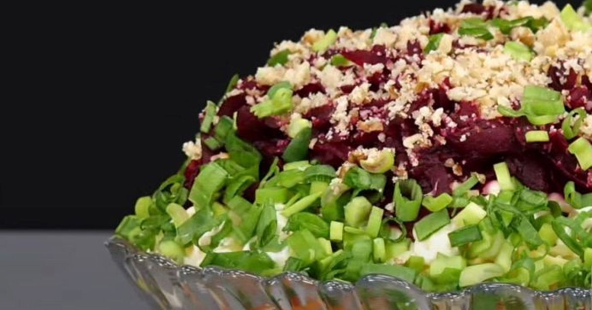 Аккуратно распределите по центру натертую свеклу. Готовый салат посыпьте измельченными грецкими орехами и украсьте зеленым луком.