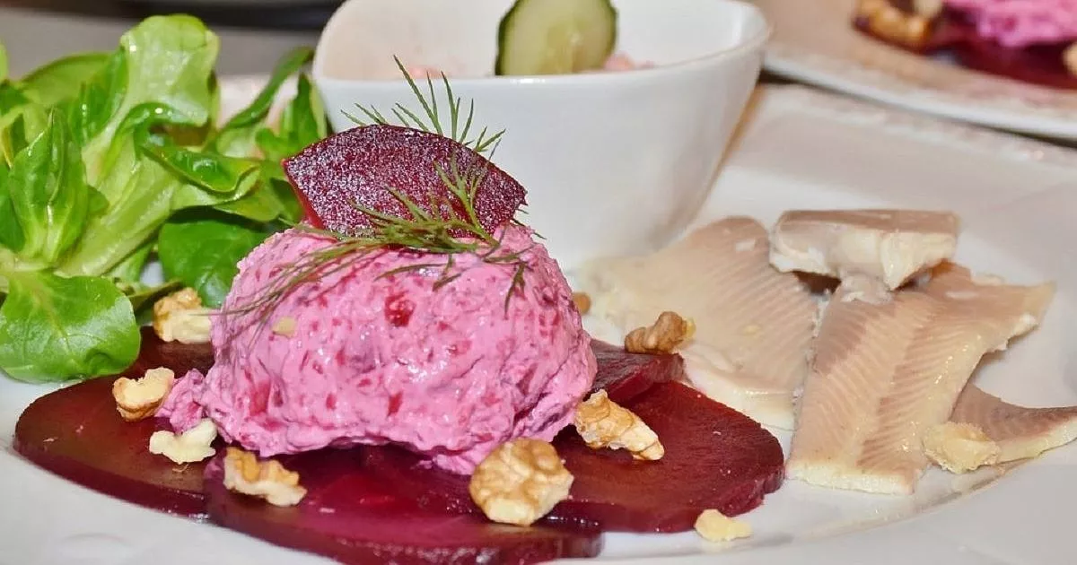 Вместо соленой селедки в салат можно положить мелко нарезанную слабосоленую скумбрию с пряным ароматом и украсить все соленой икрой селедки.