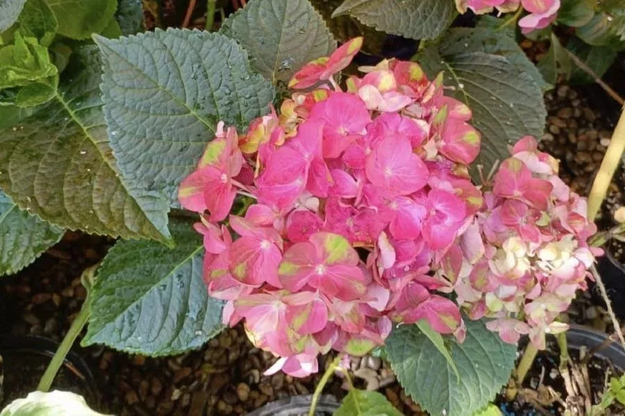При недостатке влаги гортензия жертвует цветами ради листьев, лепестки темнеют, скручиваются, даже если почва кажется влажной. Полив нужен обильный, но без фанатизма: 10–20 литров на 1 куст 2 раза в неделю летом, с учетом погоды.