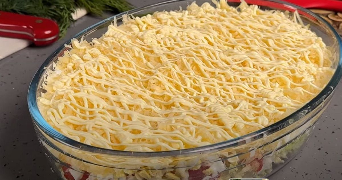Пятым, финальным слоем обильно посыпь салат натёртым сыром. Не нужно майонеза сверху, сыр сам создаст красивый вид.
