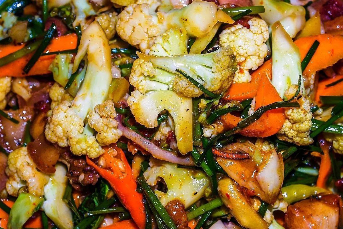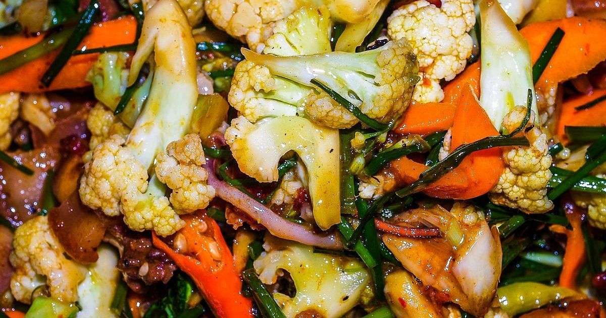 Ингредиенты: цветная капуста — 1 кг, морковь — 2 шт., болгарский перец — 2 шт., чеснок — 5 зубчиков, соевый соус — 100 мл, растительное масло — 50 мл, уксус рисовый — 2 ст. л., сахар коричневый — 2 ч. л., соль морская — 1 ч. л., кориандр молотый — 1 ч. л., кунжут белый — 2 ст. л., зелень свежая (укроп, петрушка) — небольшой пучок.