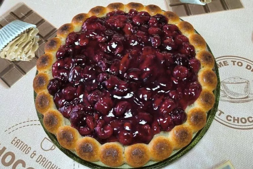 Сними с огня и дай полностью остыть. Готовый пирог полностью остуди в форме, затем переверни на решётку. Широким ножом или лопаткой аккуратно разрежь его вдоль на два коржа, если хочешь прослойку внутри, или просто выложи остывший вишнёвый конфитюр сверху, разравнивая его по всей поверхности.