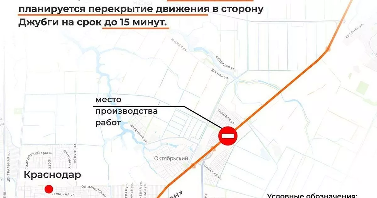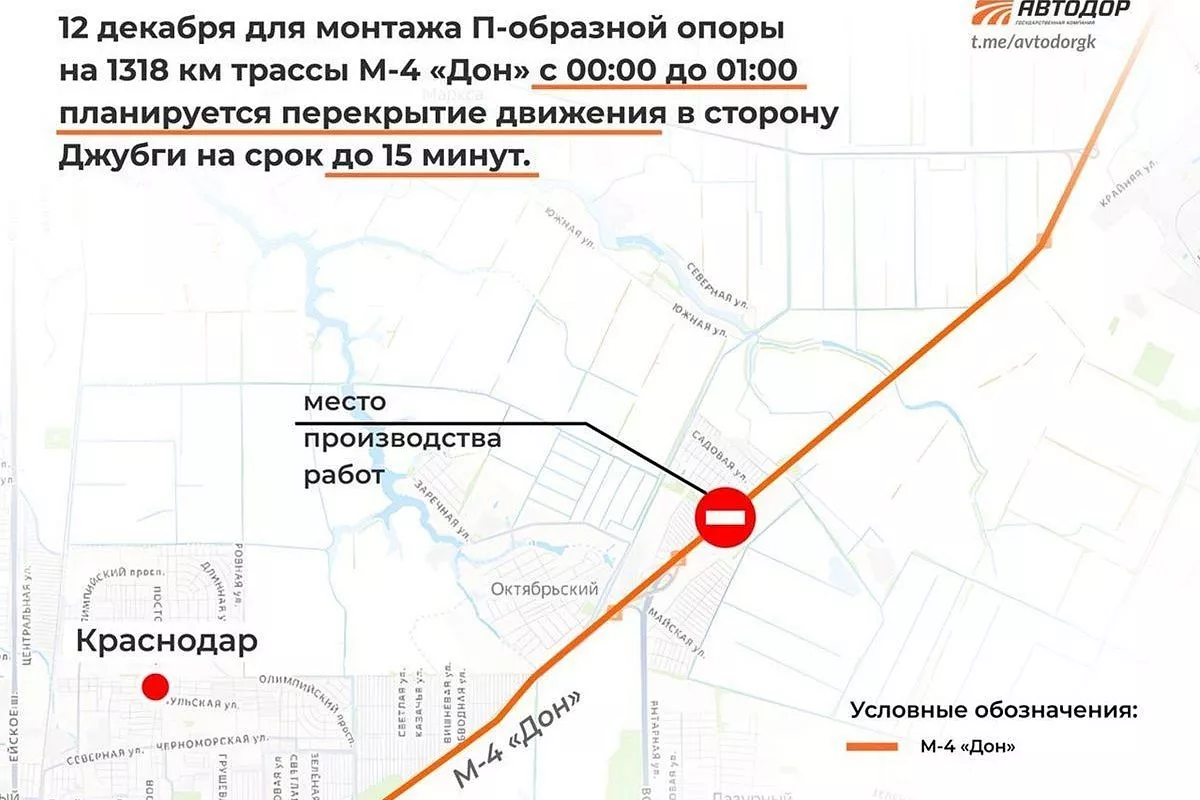 - На 1318 км трассы М-4 «Дон» (район хутора Октябрьский) ночью 12.12.25 с 0.00 до 01.00 планируется проведение работ по восстановлению П-образной опоры для крепления дорожного указателя, - говорится в публикации компании. - В этом промежутке времени будет введена кратковременная приостановка движения по прямому ходу (в направлении Джубги) на срок до 15 минут.