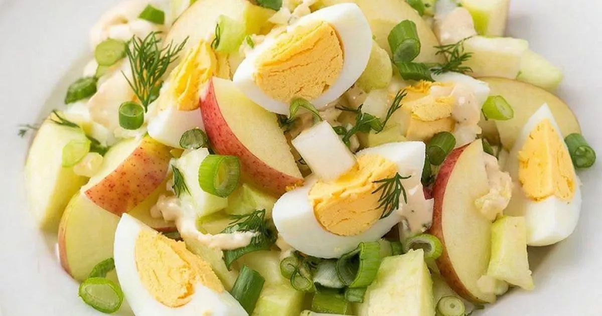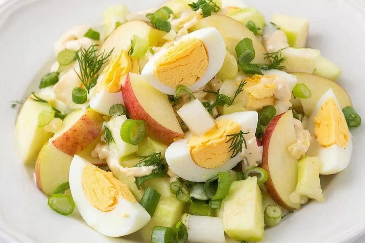 Ингредиенты: репчатый лук — 1 шт.; куриные яйца — 2 шт.; яблоки (кисло-сладкие) — 2 шт.; голландский сыр — 70 г.; майонез — 2–3 ст. л.; соль и перец — по вкусу.