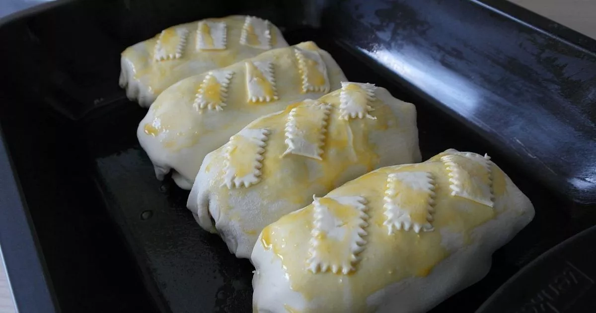 «Лепим» пирожки. Аккуратно раскатываем скалкой тесто толщиной около 3 мм. Вырезаем круги или квадраты нужного размера, кладем в середину начинку (1-2 ст.л.) и защипываем края. Ваши домашние пирожки из готового слоеного теста могут быть любой формы - традиционно овальной, квадратные, треугольные. Важно ведь не какой они формы, а насколько они вкусные получатся! Смажем поверхность пирожков взбитым яйцом, чтобы получилась красивая золотистая корочка. Запекаем в предварительно разогретой духовке при температуре 180 градусов примерно 20-30 минут, пока пирожки не станут румяными и аппетитными. Приятного аппетита!