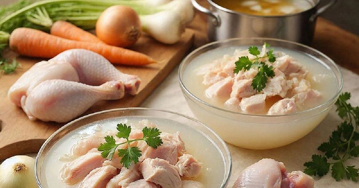 Достаньте мясо и овощи из кастрюли, а сам бульон процедите через мелкое сито или марлю, чтобы избавиться от мелких костей. Осталось самое простое: разобрать мясо на более мелкие кусочки, удалить косточки и кожу. Крупные куски мяса разрежьте ножом.